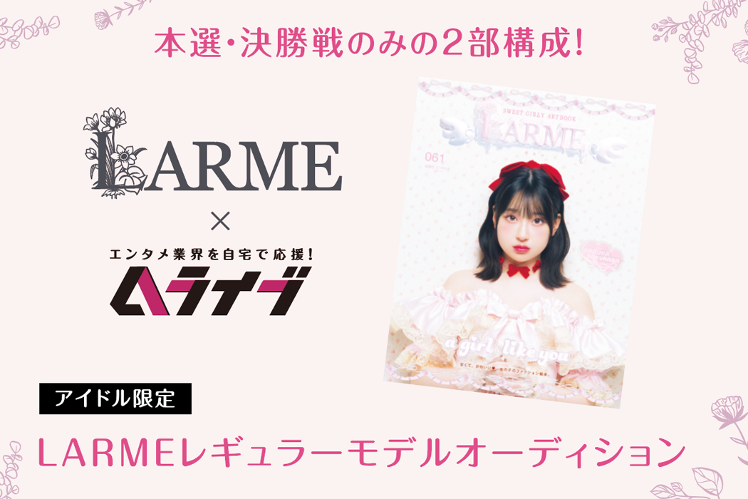 甘くて、かわいい♡女の子のファッション絵本、あの「LARME」のレギュラーモデルオーディションをAライブにて開催。アイドルさんのみでの限定開催となります。優勝者はLARMEレギュラーモデルとして2025年度の掲載が確定となるだけでなく、LARME 065にて特装版表紙の発売も決定!!!さらにはLARME賞やファイナリスト特典などもご用意しております。